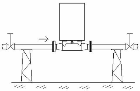 传感器的安装如图三所示,现做以下说明: (1)JGKLB-CMFI型质量流量计一般安装在水平管道上,主体部分自然垂直向下。安装时注意流量计上标注的流向标志应与管道中的液体流向相同,如果流向标志因长期使用不清晰时,也可参考图三判断传感器流向:当传感器的电缆插座在背面时,流向为从左向右; (2)流量计的上游和下游需安装固定支撑架; (3)安装时要保证流量计的法兰盘与管道上的法兰盘同心,拧固定螺栓时要保证多个螺栓均匀受力,不可强迫对位,以免一次表上产生扭矩或弯矩; (4)流量计下游管道需要有一定的背压,不能直接处于开放状态,防止管道内液体不能充满,造成测量不正确; (5)流量计必须离开地面,也不能与其它物品相接触; (6)流量计上游管道口径可以大于或等于流量计口径,不能小于; (7)测量易气化的液体,要将流量计传感器整体加保温材料保护,以免结露或结霜损坏传感器; (8)对DN6、DN10两个螺纹接嘴的型号,上述(3)、(5)条不适用。安装时传感器需固定在地面,用软管连接到管道 (9) 传感器和变送器的编号要一一对应,否则可能产生测量误差。