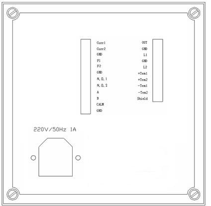 后面板上右边第一列是十针接线端子座,该座从上至下,第一和第二针与激振器连接(标示OUT, GND);第三、第四和第五针分别与左右位移传感器连接(标示L1, GND, L2);第六、第七、第八和第九针与温度传感器连接(标示+Tem1, +Tem2, -Tem1, -Tem2);第十针接电缆屏蔽层(标示Shield)。与十针接线端子座对应相连接的十根线颜色分别是棕、红、橙、黄、绿、蓝、紫、灰、白、粉(黑)。连接这十针接线端子座插头及电缆出厂时已连接好,用户不要自行改动。如铺设电缆时需要拆下插头,要记住连接顺序,以便按原样恢复。 后面板上右边第二列是十二针接线端子座,该座从上至下,第一和第二针是输出通道1(ch1)和通道2(ch2)4mA~20mA电流信号(标示Curr1, Curr2),第三针是电流信号的地线(标示GND);第四针和第五针是输出通道1(ch1)和通道2(ch2)0Hz~10kHz频率信号(标示F1,F2),第六针是电流信号的地线(标示GND);第七和第八针是全关阀批量控制继电器1常开触点输出(标示N.O.1, N.O.2),用户订货时预先说明,可改为常闭触点输出;第九和第十针用于RS485数据通信(标示A, B);第十一和第十二针用于清除批量质量累加值(标示CALM, GND),外接按钮按下批量显示清零,开始下次批量控制。 后面板上左下角是电源插座,电源是AC 220V/50Hz。插座上有保险丝。 1.3.1.2本安型流量计变送器前面板说明 本安型流量计的变送器前面板示意图见图五。