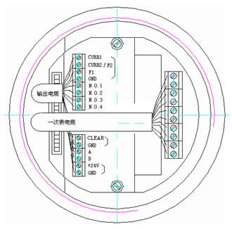 本安型流量计前面板的中央是显示窗口,用于显示数据及提示信息。 显示窗口下面有三个按键,从左至右分别是上翻键、下翻键及回车键,变送器的操作主要就是操作这三个按键。打开三个按键下面的翻盖,里面是回车同步按钮和电源开关。 注意:回车同步按钮必须与回车键同时按下,回车键才会起作用。设置该按钮专门用于防止误操作。 1.3.2复合型流量计变送器 复合型流量计的变送器前面板有显示窗口、上翻键、下翻键、回车键和回车同步键。有两条电缆引出:一条短电缆一端接有插头,与传感器相接;另一条有十根芯线的长电缆,提供给用户使用。 1.3.2.1复合型流量计变送器接线说明