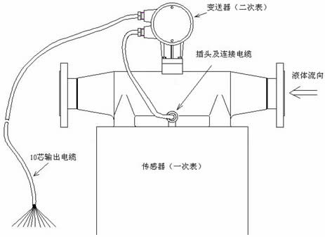 复合型流量计的变送器用随机附送的四个内六角螺丝直接固定在传感器之上,两者之间由屏蔽电缆连接。变送器电源为直流24V。随机附送一条接地线,该地线一端拧在固定螺丝上,另一端要与地相连。