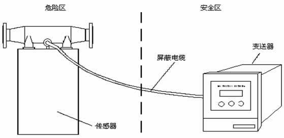 产品组成部分: 本产品由传感器(一次仪表)和变送器(二次仪表)两部分组成。 传感器是质量流量计的机械部分,内部装有激振器、位移传感器和温度传感器。 变送器是仪表的显示部分,也是仪表的电气部分。它内部装有电源、模拟电路、数字电路、显示器和输出等,基本功能是:接收并处理传感器的电信号,经过处理直接得到质量流量、体积流量、温度和密度等,可以显示、输出、储存和远程传输;修改流量计参数。变送器内部都装有安全栅,起防爆隔离保护作用。 复合型流量计的传感器是本质安全型,变送器是隔爆型,传感器和变送器都可以在爆炸性气体环境下工作,可以放在危险区。 本安型流量计的传感器为本质安全型,可以在爆炸性气体环境下使用,变送器只能在安全环境下工作。