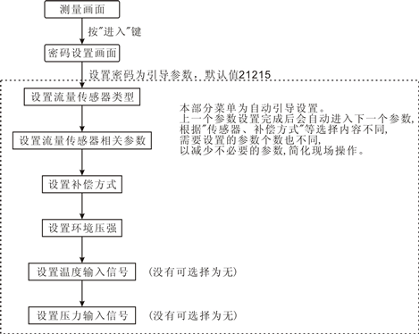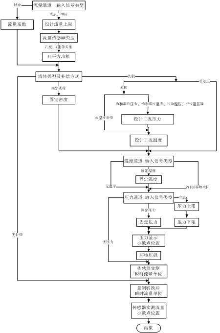具体的参数流程如下图所示。选择了一条支路,则其他支路的参数自动隐藏。例如选择“流量通道 输入信号类型”为脉冲,则不再显示“设计流量上限”“流量传感器类型”“开平方功能”参数。